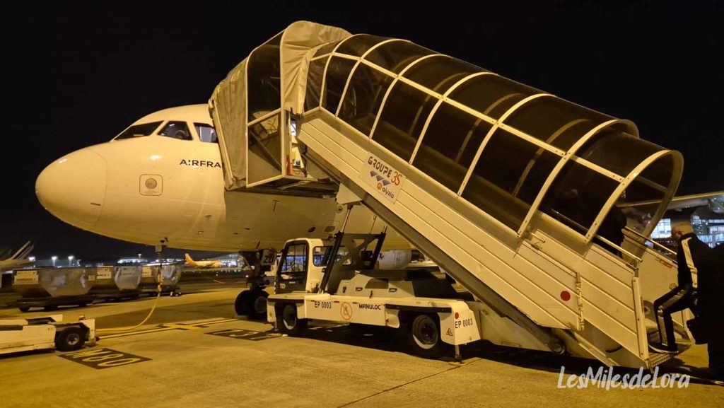 À 20H55 l’embarquement est appelé. D’abord pour les Ultimate, mais personne ne se présente, et ensuite pour les Sky Priority. J’emprunte la passerelle et quelle ne fut pas ma surprise de voir un escalier au bout. Et oui, nous devons descendre sur le tarmac où un bus nous attend. Quelle ironie du sort !