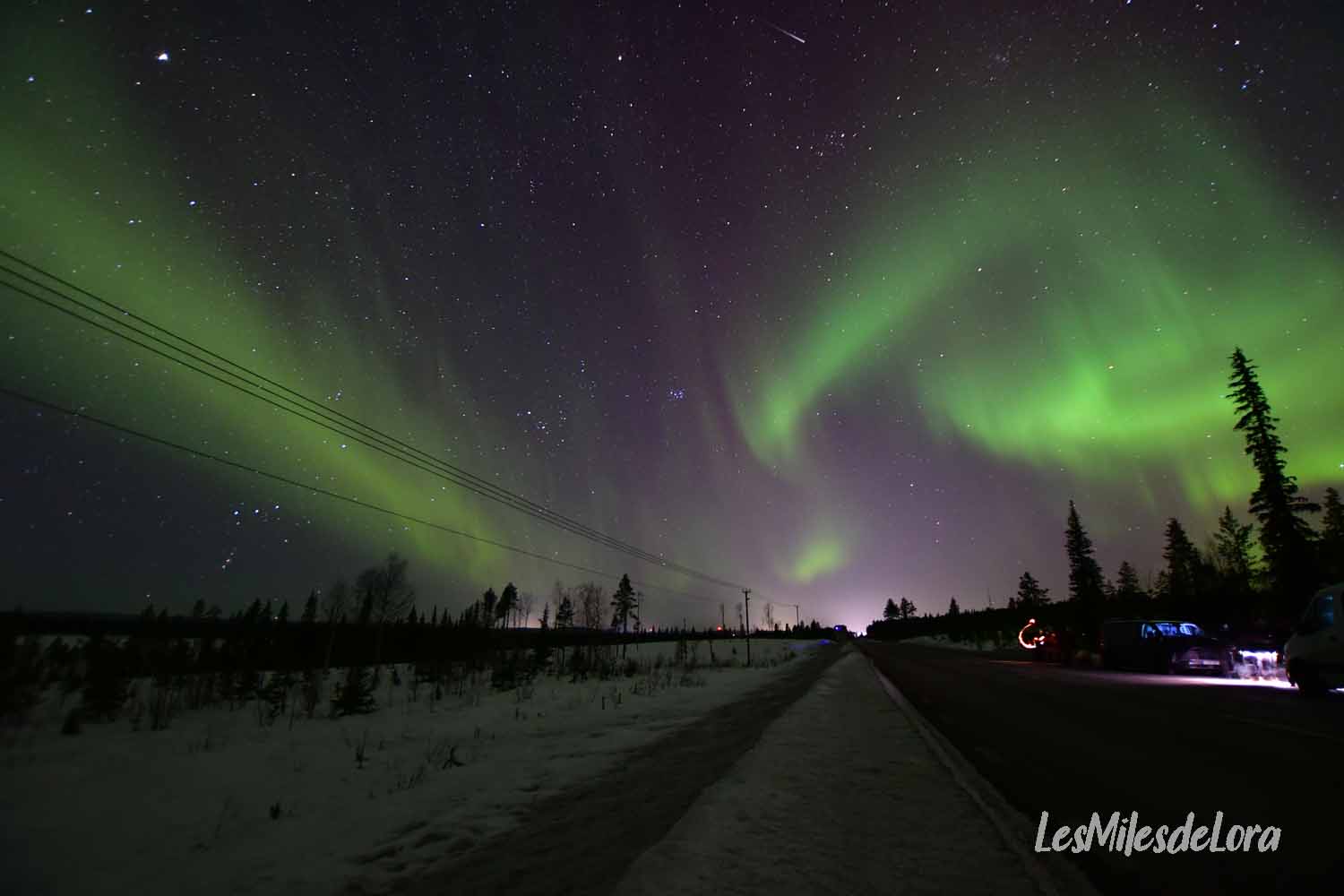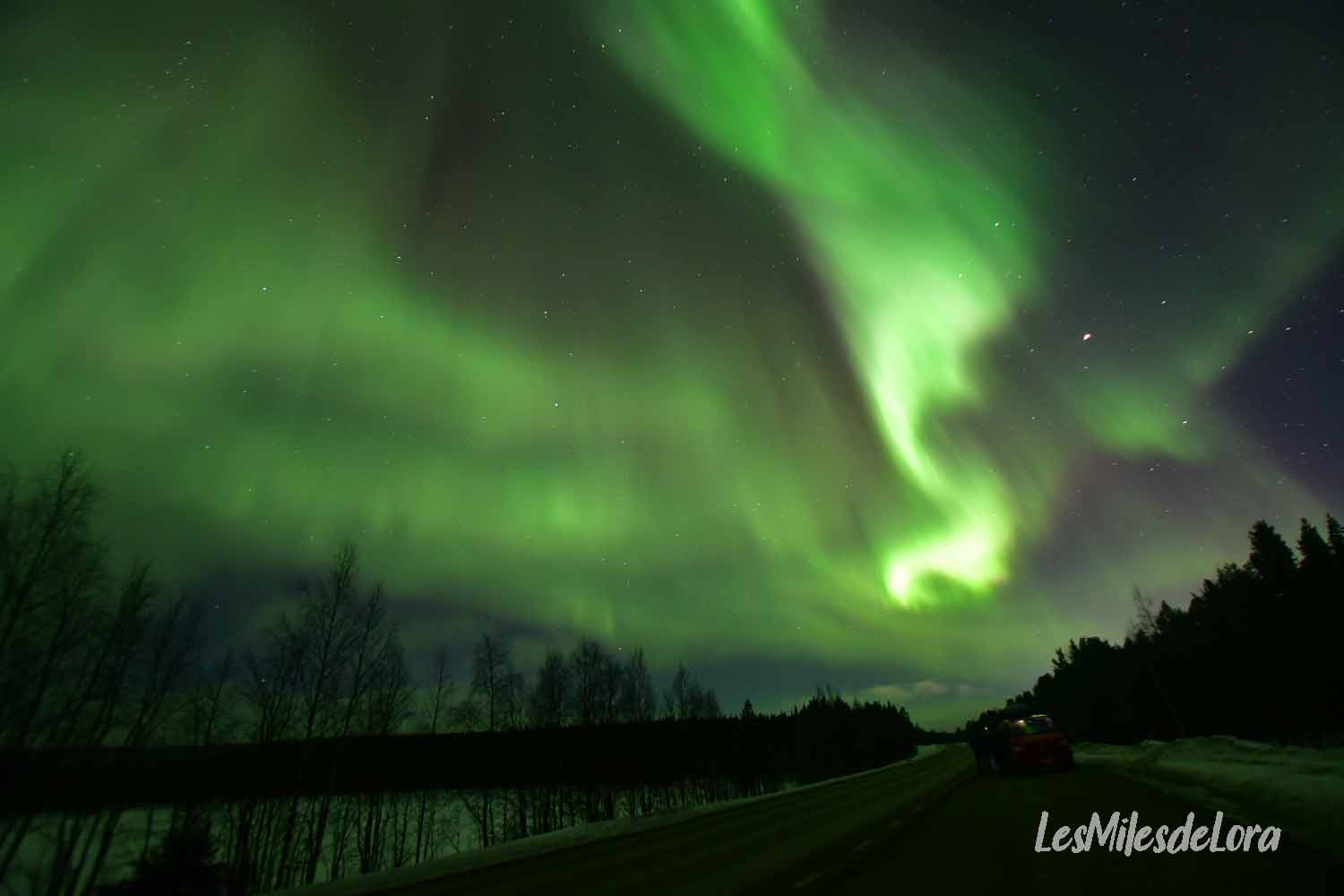 Toujours en bord de route, nous faisons un stop avant Vittangi, où nous sommes rejoints par beaucoup d’autres chasseurs. Nous sommes loin d’être les seuls sur la route ce soir, et la plupart des autres vans croisés sont aussi des chasseurs d’aurores.